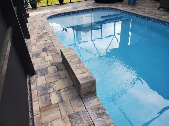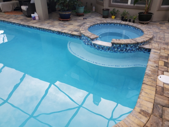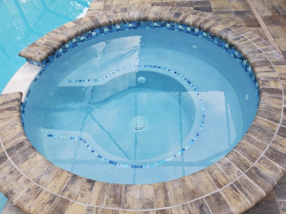 Rectangular pool with round spa and paver deck.